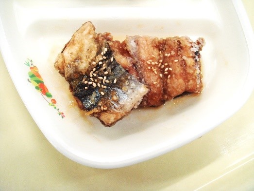 - さんまの開きに片栗粉を付けて油で揚げる。